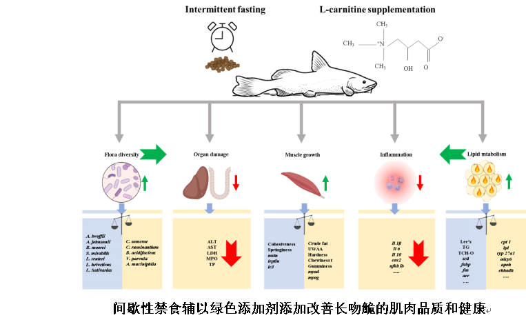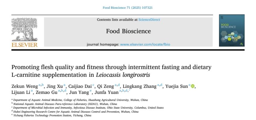 2025年8月5日,伟德国际1946官方网袁军法副教授团队在国际学术期刊Food Bioscience发表了题为“Promoting flesh quality and fitness through intermittent fasting and dietary L-carnitine supplementation in Leiocassis longirostris”的研究论文。该研究综合利用现代生物技术,成功研发长吻鮠环保高效暂养技术。相比传统的“瘦身”(吊水)养殖模式,采用间歇性禁食辅以绿色添加剂添加的方法暂养28天显著提升鱼肉品质和风味,减轻长期饥饿引起的体重损耗和死亡状况,维护鱼体健康。