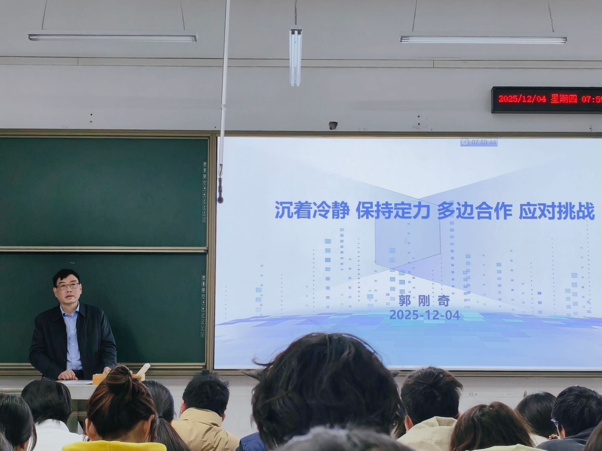 12月4日上午,郭刚奇老师则以“沉着冷静 保持定力 多边合作 应对挑战”为题讲授了另一堂《形势与政策》课。他以“世界在变,我们怎么办?”为指引,聚焦当前波谲云诡的国际局势,用洪亮的声音、专业的视角,从地缘政治冲突到国家间战略博弈,将诸多热点议题巧妙融入课堂,为同学们抽丝剥茧、厘清脉络,引导大家理性看待世界之变、时代之变。课堂气氛活跃,师生互动高效,同学们思维紧跟讲授,展现了浓厚的学习兴趣。