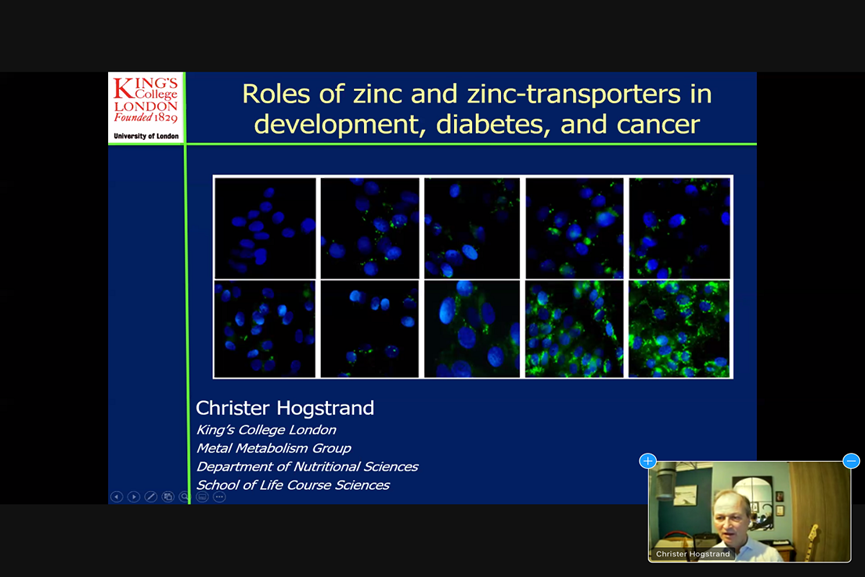 伦敦国王学院的Christer Hogstrand教授通过介绍全世界锌缺乏的患病率及其所导致的一系列病症,介绍了对锌和锌转运蛋白在个体发育、糖尿病和癌症中相关作用的研究,探究锌及新转运蛋白在机体中参与的信号通路及调节机制。