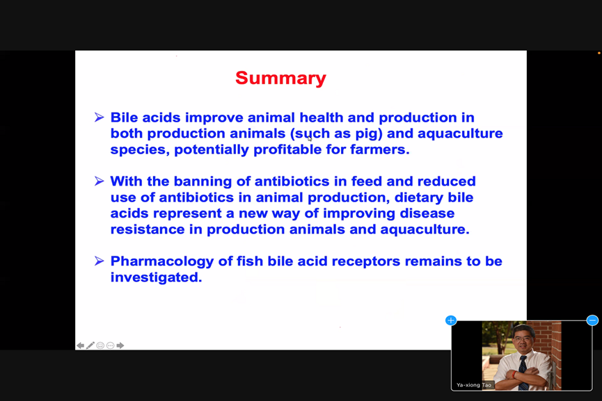 来自奥本大学的Ya-Xiong Tao教授以“Metabolites as novel signaling molecules for G protein-coupled receptors”为题进行报告,对鱼类中G蛋白偶联受体的激活位点、信号通路、药理学研究及在水产养殖中的开发应用等进行介绍,为研究代谢物对鱼类免疫系统、内分泌系统及肠道稳态等提出了新的见解。