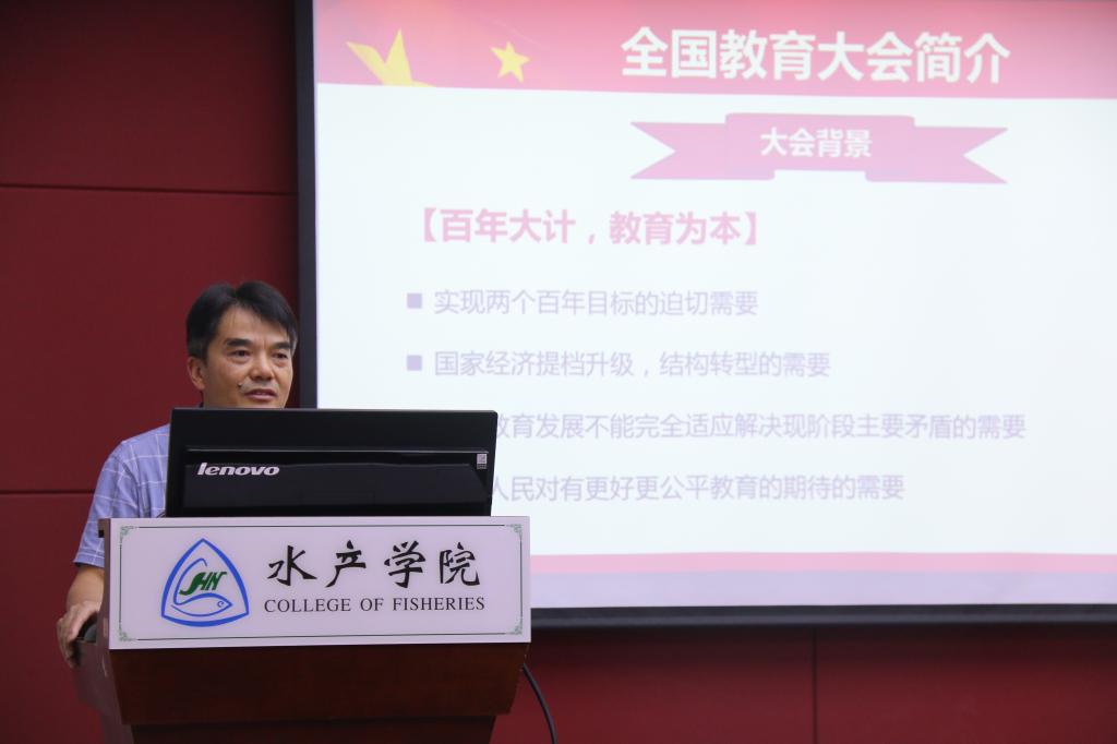 核心提示:9月29日下午,伟德国际1946官方网“全国教育大会重要讲话精神学习”辅导会议在水产楼109天辰报告厅召开,伟德国际1946官方网全体教职工参加,学院党委书记张韶东主持会议。