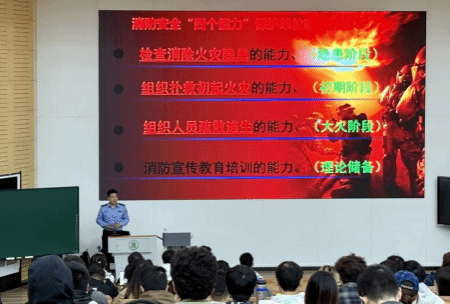 讲座开始前,吴飞越教官播放了消防宣传视频。随后,他从消防安全“四个能力”分别进行了宣传及培训,包括检查消除火灾隐患、组织扑救初起火灾、组织人员疏散逃生、消防宣传教育培训四个不同阶段的能力。吴飞越以典型火灾案例为基础,通过触目惊心的事故现场照片与视频、详尽的数据,深刻剖析了电动车违规进楼充电、老旧插排超功率等多个火灾案例发生的原因及危害,使同学们直观地了解到火灾发生的突发性与破坏性。“除了火灾的扑救,检查与消除潜在的火灾风险尤为重要。”吴飞越结合伟德国际1946官方网实验室水产养殖设备密集、用电负荷较高的专业特点,重点讲解了电器火灾预防、易燃试剂存储等针对性安全知识,并教学使用火灾报警器、灭火器、消火栓等多个消防设施。