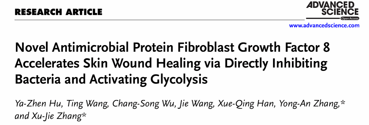 近日,伟德官网伟德国际1946官方网鱼类免疫与病害防控团队在Advanced Science期刊上发表题为“Novel Antimicrobial Protein Fibroblast Growth Factor 8 Accelerates Skin Wound Healing via Directly Inhibiting Bacteria and Activating Glycolysis”的研究论文。该研究首次揭示成纤维细胞生长因子8(FGF8)兼具抗菌与代谢调控双重功能,可通过直接杀灭细菌并激活糖酵解加速皮肤伤口愈合,为开发新型抗感染促修复药物提供了重要理论基础和候选分子。