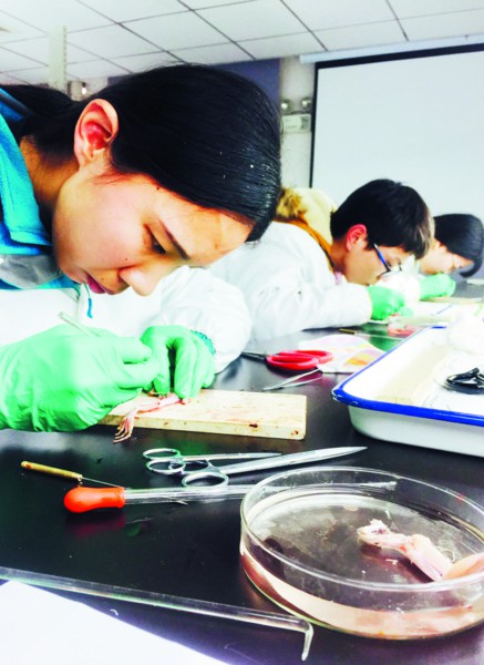 青蛙一只,剪刀、镊子等若干。学生们取青蛙,解剖,暴露心脏。“开始!”随着实验小组长一声令下,同学们开始掐表,测定青蛙在体心率,多次测量心率为27次/分钟。随后,小组长召集组员给青蛙做心脏插管手术,并用实验试剂润洗后转移到实验装置台上测定。“看上去容易做起来难,每一步都不能有差错,不然就前功尽弃了。”实验指导教师汤蓉副教授指着还在跳动的离体心脏说。