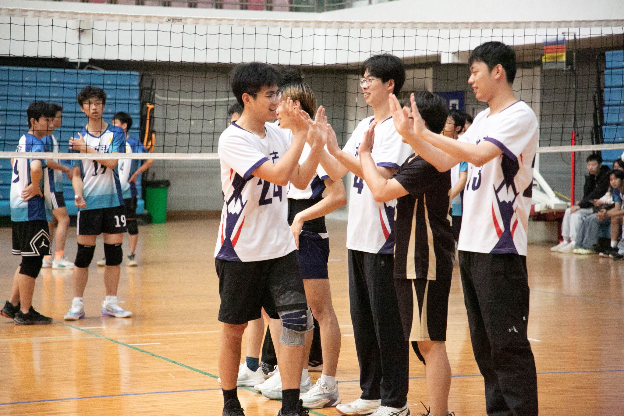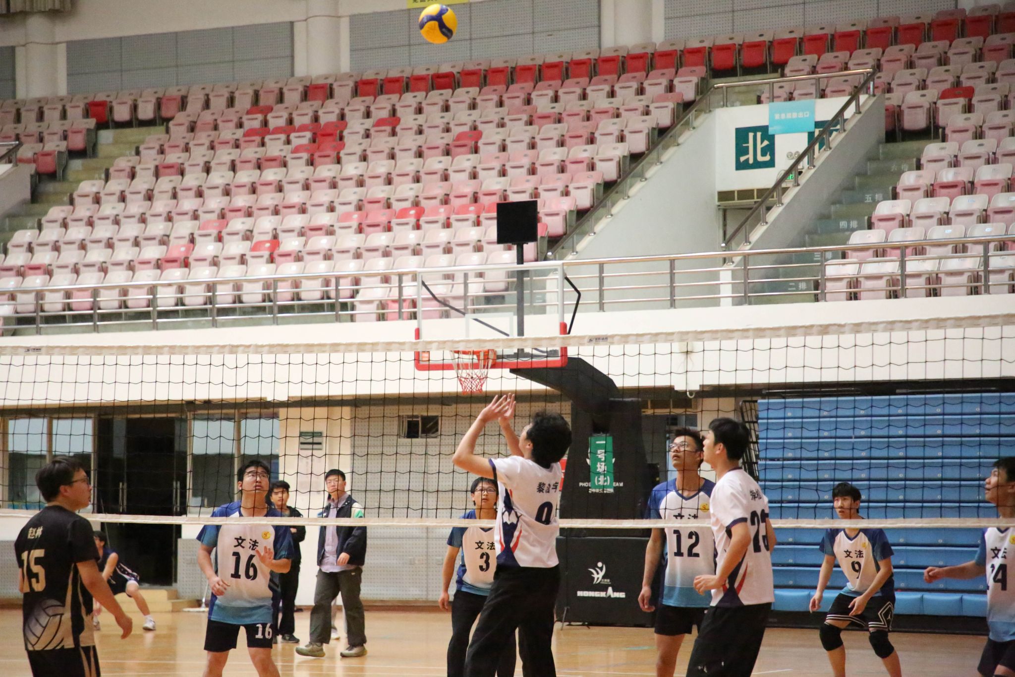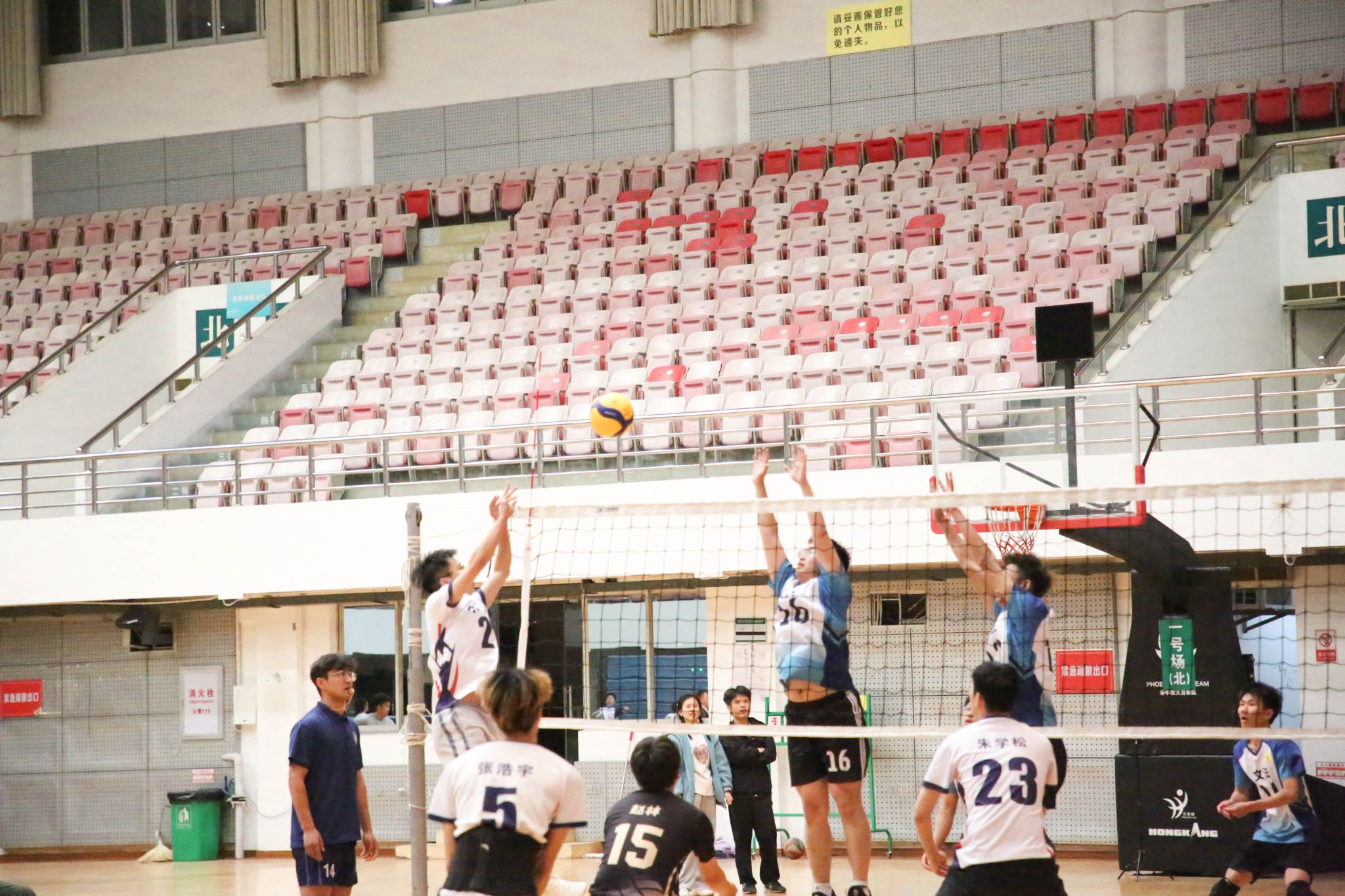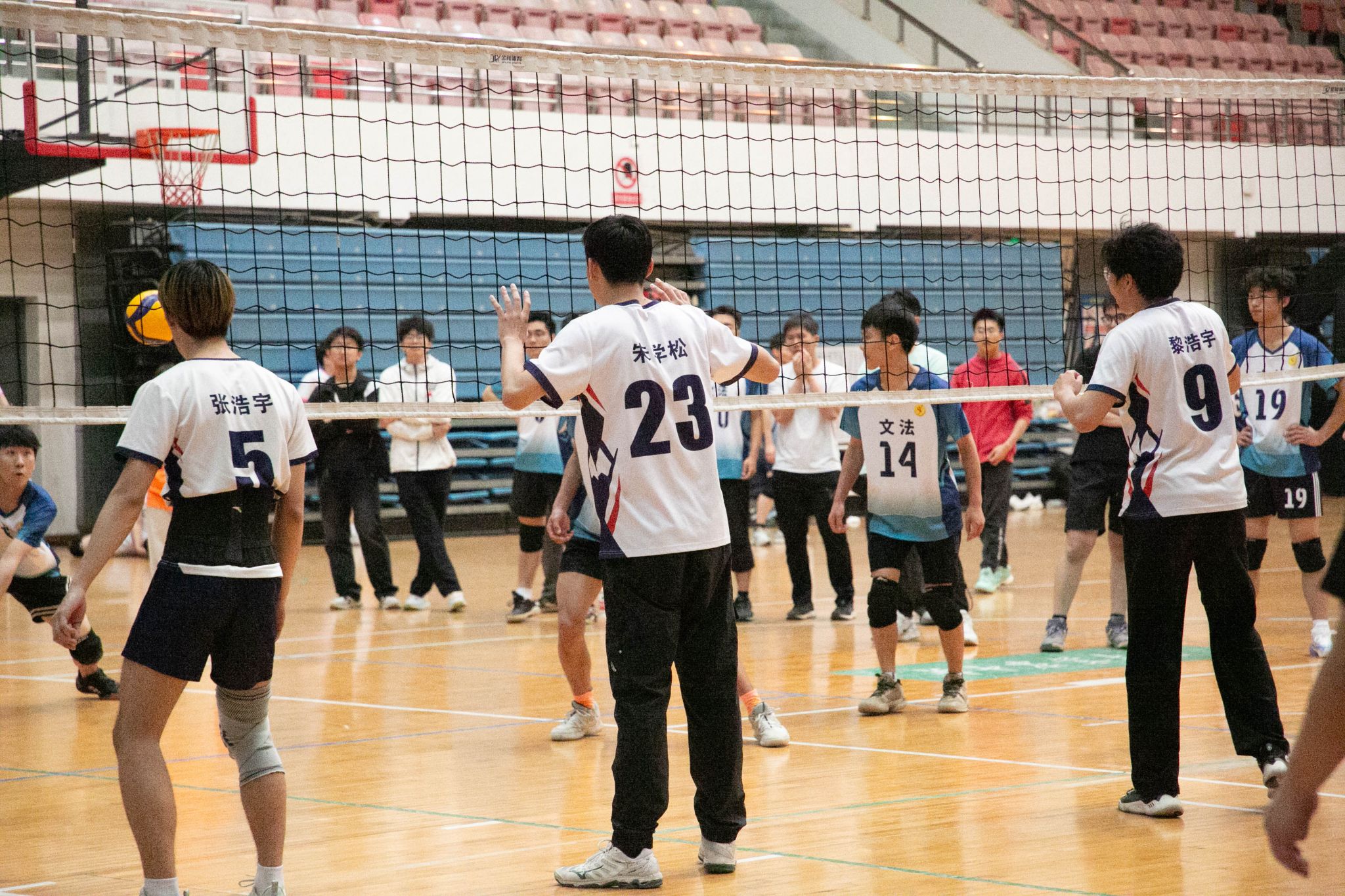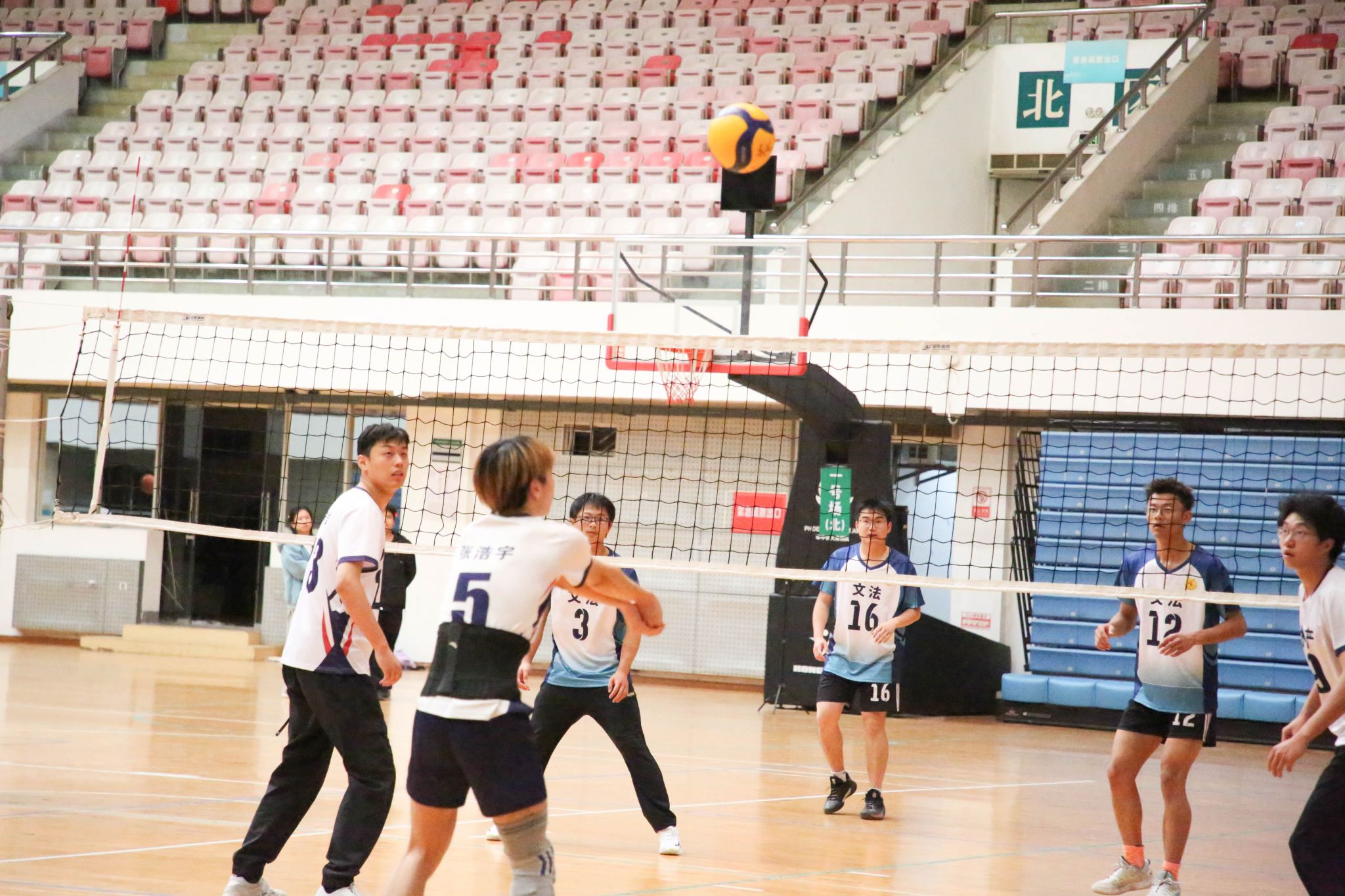 4月12日19点,伟德国际1946官方网2024年狮子山杯排球赛男子组5、6排位赛,于西体育馆顺利举行。本次交手的两支队伍分别来自伟德国际1946官方网和文法学院,主持人依次介绍双方队员及裁判员,双方球员握手致意。