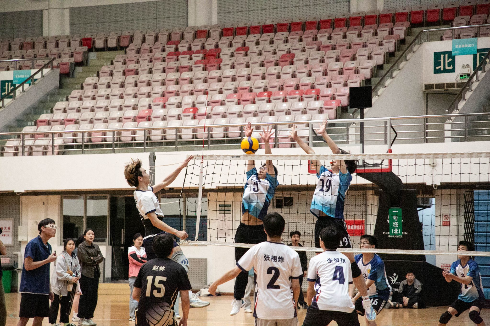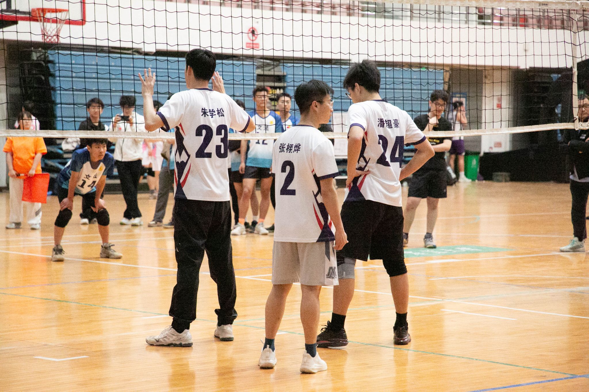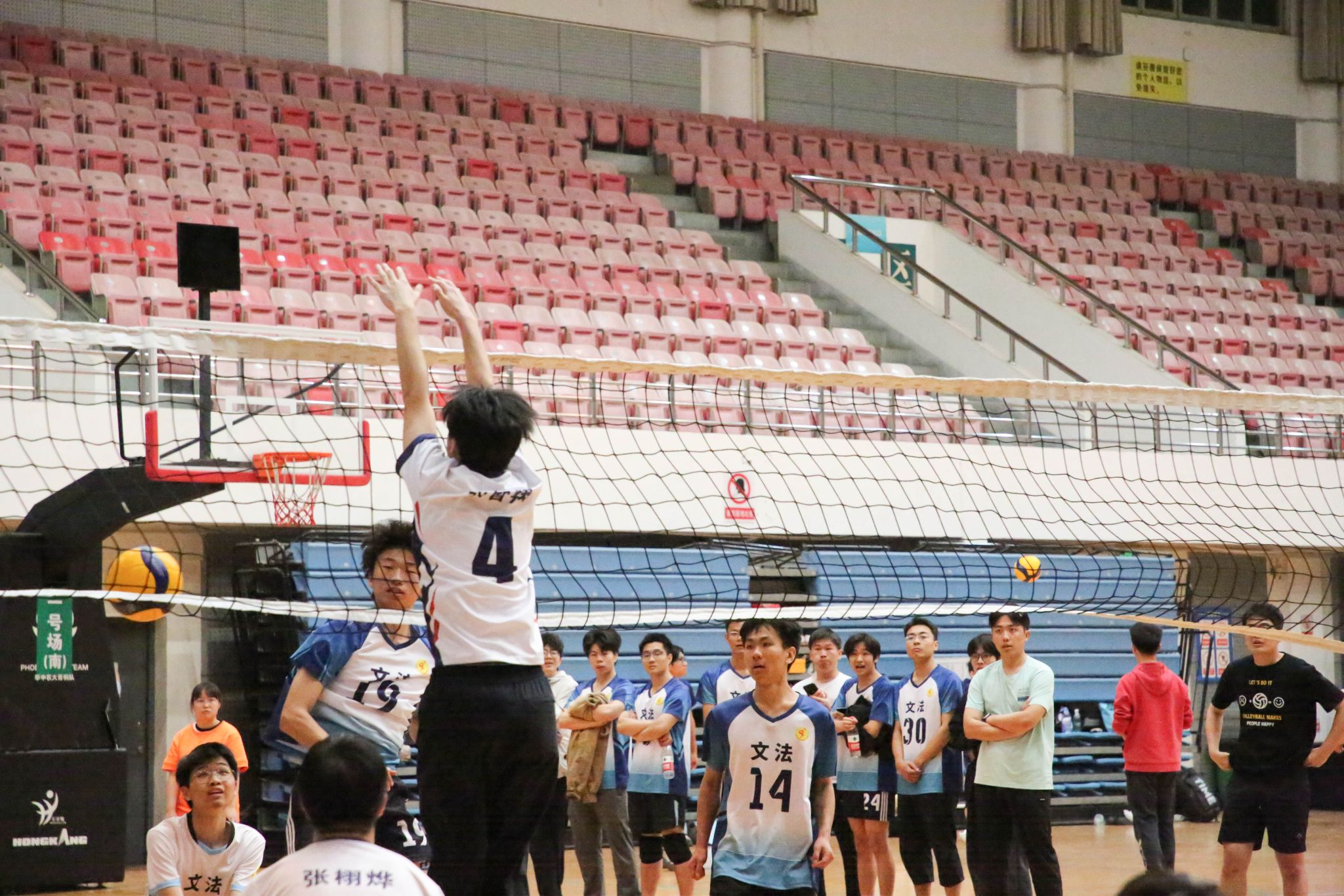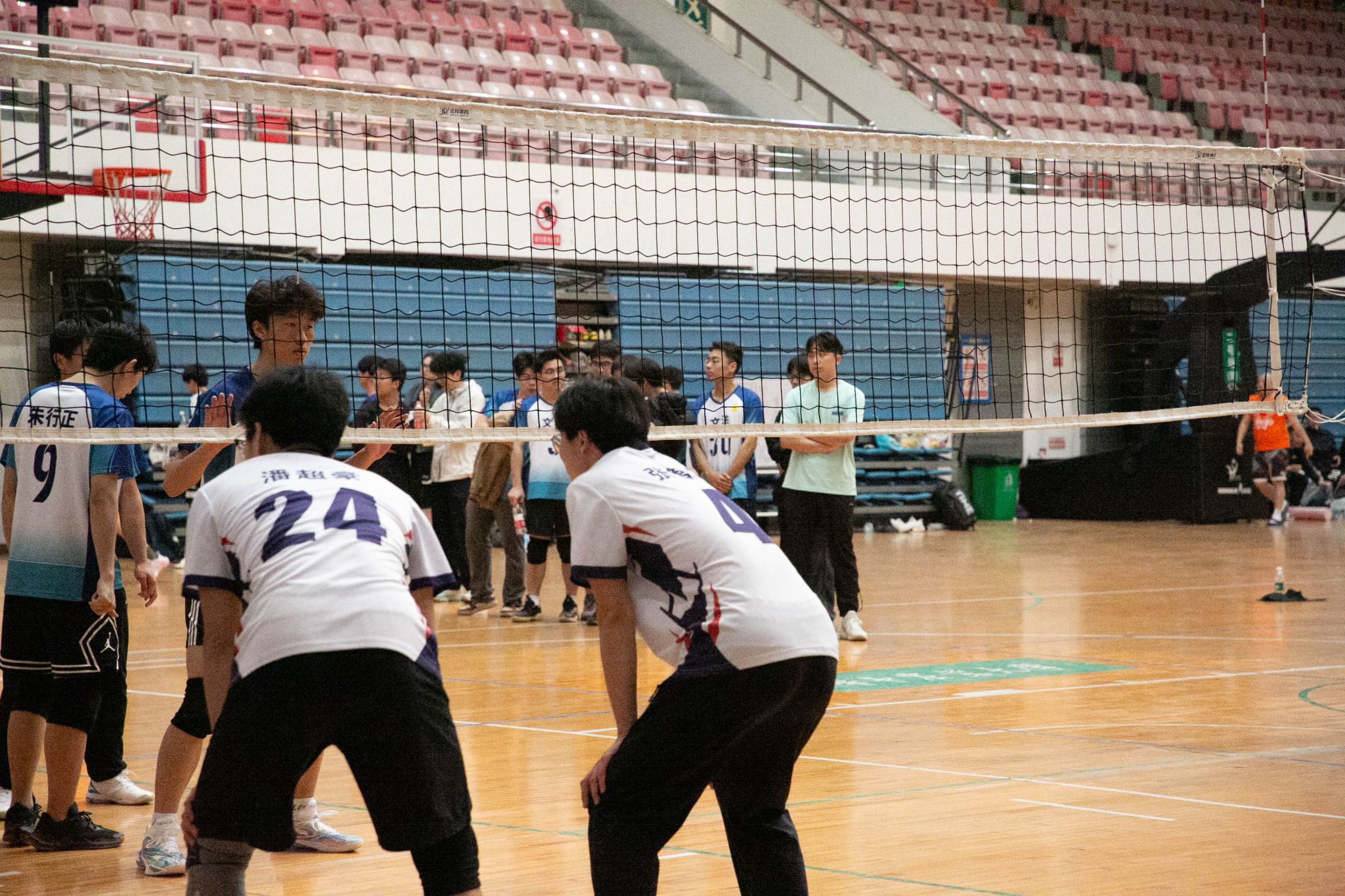 4月12日19点,伟德国际1946官方网2024年狮子山杯排球赛男子组5、6排位赛,于西体育馆顺利举行。本次交手的两支队伍分别来自伟德国际1946官方网和文法学院,主持人依次介绍双方队员及裁判员,双方球员握手致意。
