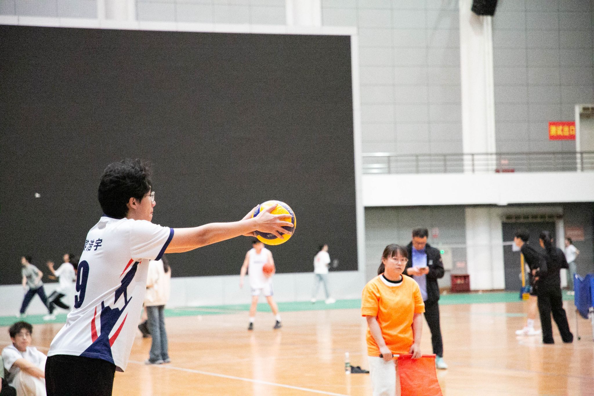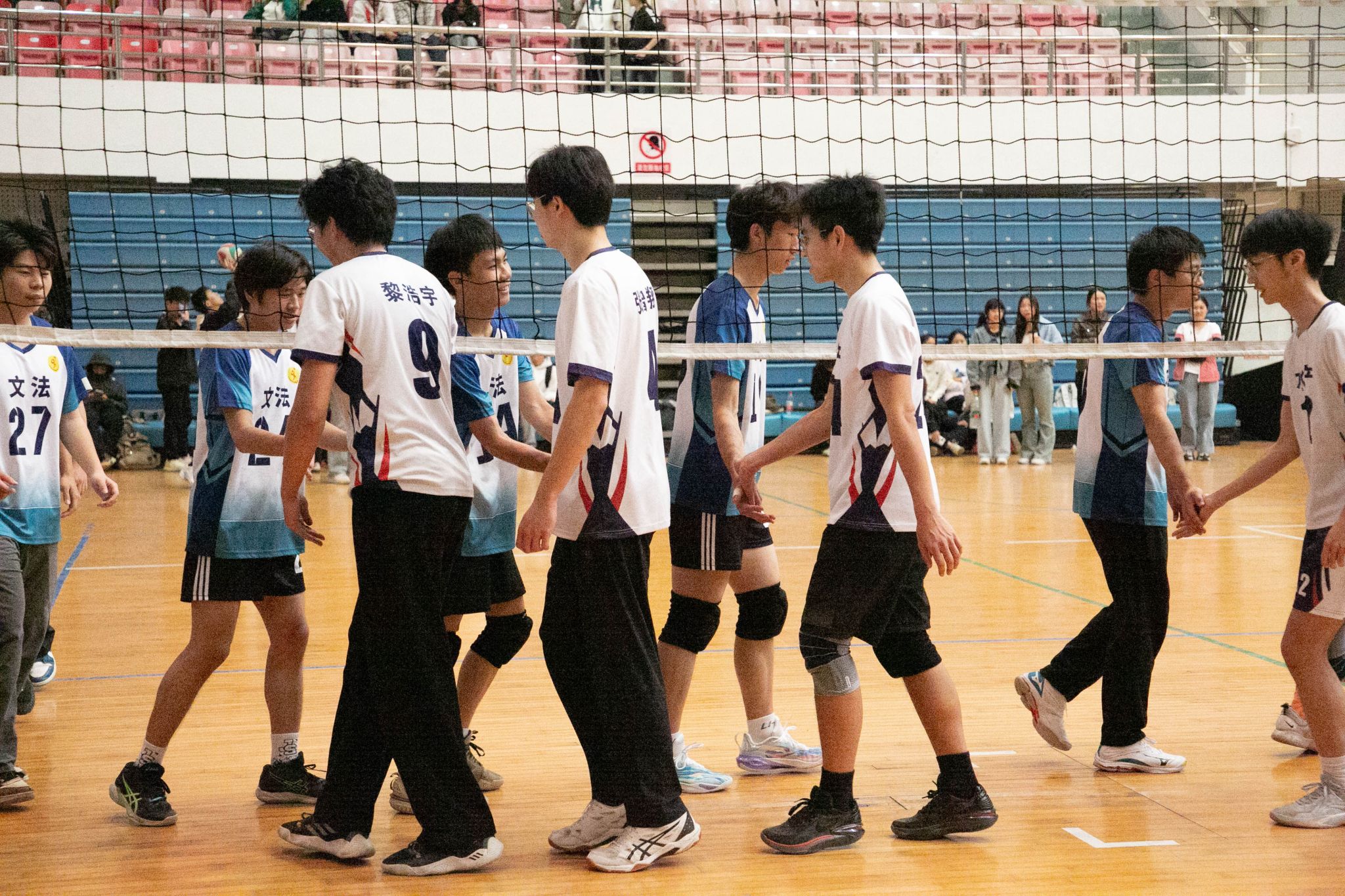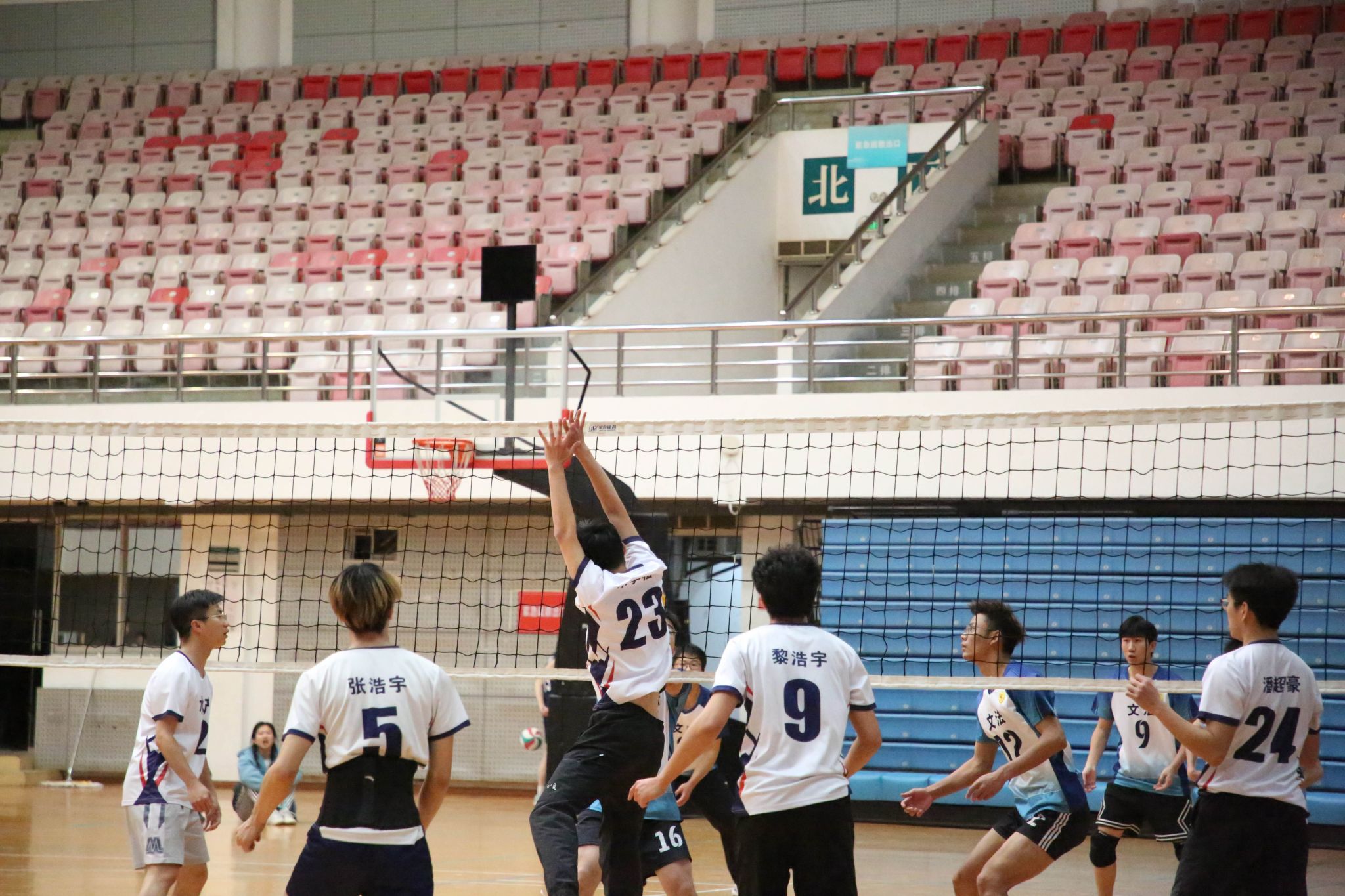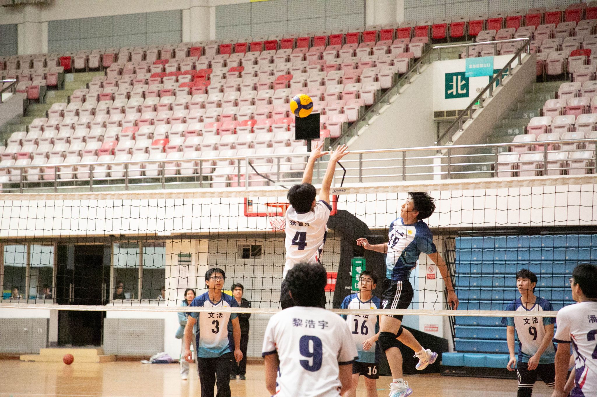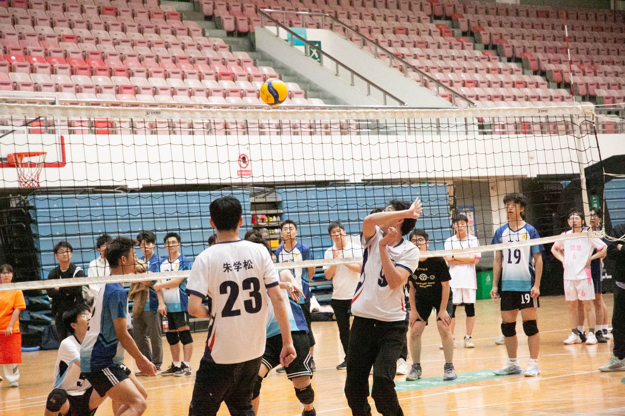 4月12日19点,伟德国际1946官方网2024年狮子山杯排球赛男子组5、6排位赛,于西体育馆顺利举行。本次交手的两支队伍分别来自伟德国际1946官方网和文法学院,主持人依次介绍双方队员及裁判员,双方球员握手致意。