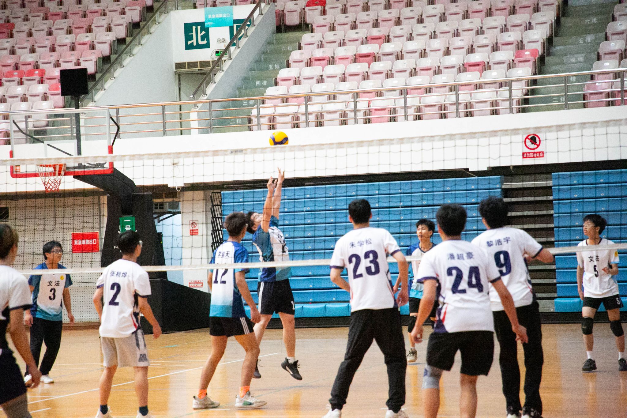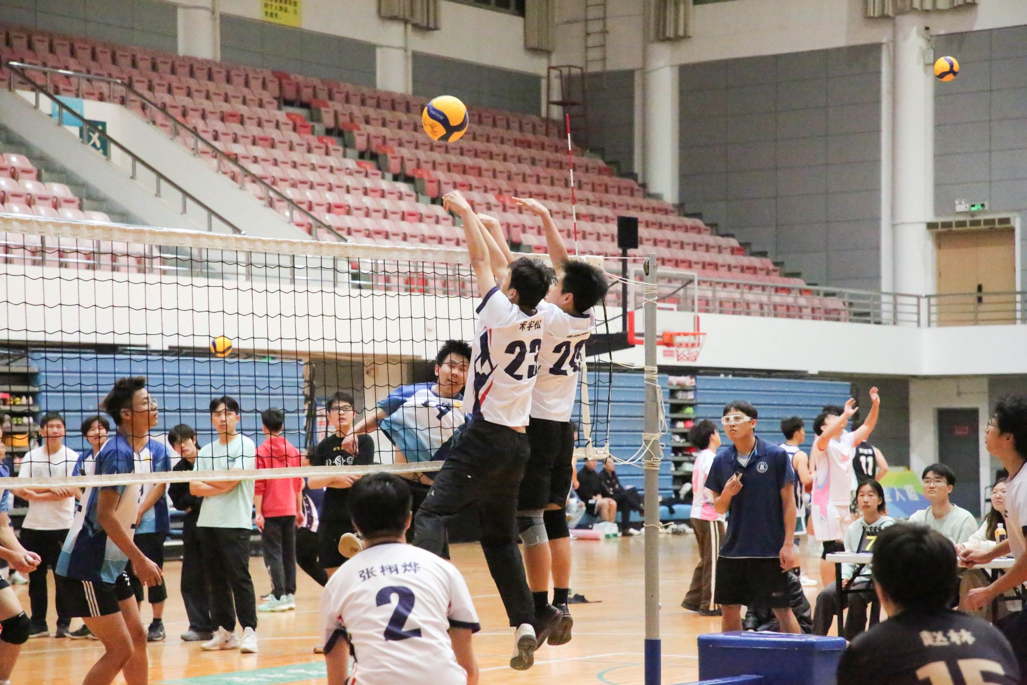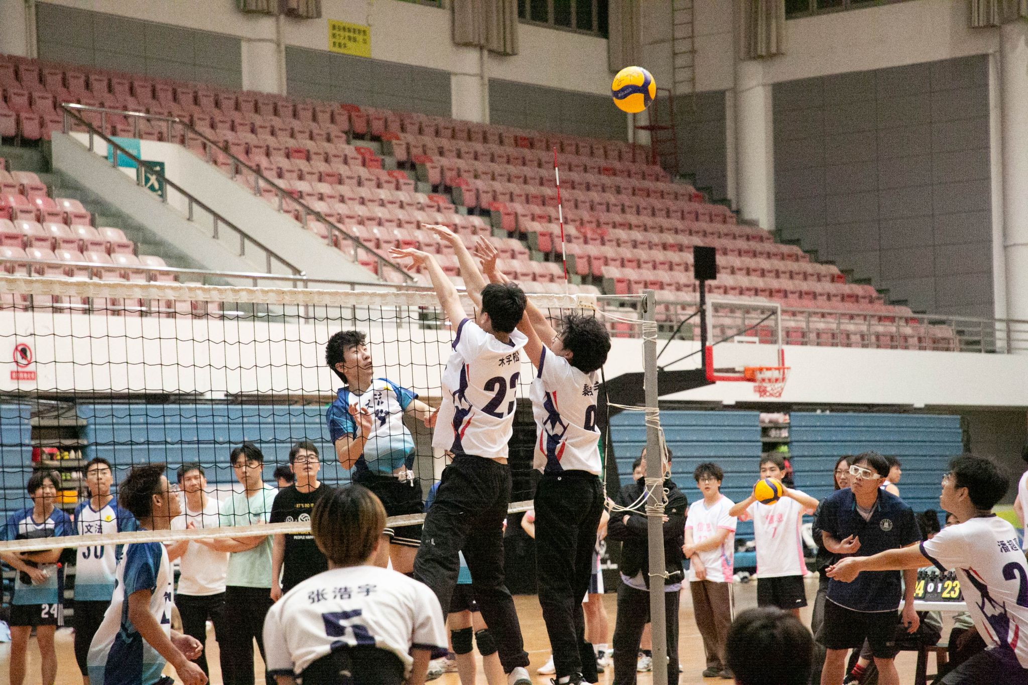 易边再战,水产男排遭遇强力阻击,开局0-3落后被迫请求技术暂停。经战术调整后,接应潘超豪以一记小斜线霹雳重扣吹响反攻号角,连续突破对方拦防实现9-8精彩反超。双方此后展开拉锯战,比分七度打平直至22-22白热化阶段。关键分争夺中,文法男排凭借发球破坏一传体系,最终以25-23险胜扳回一局,将比赛拖入决胜局争夺。