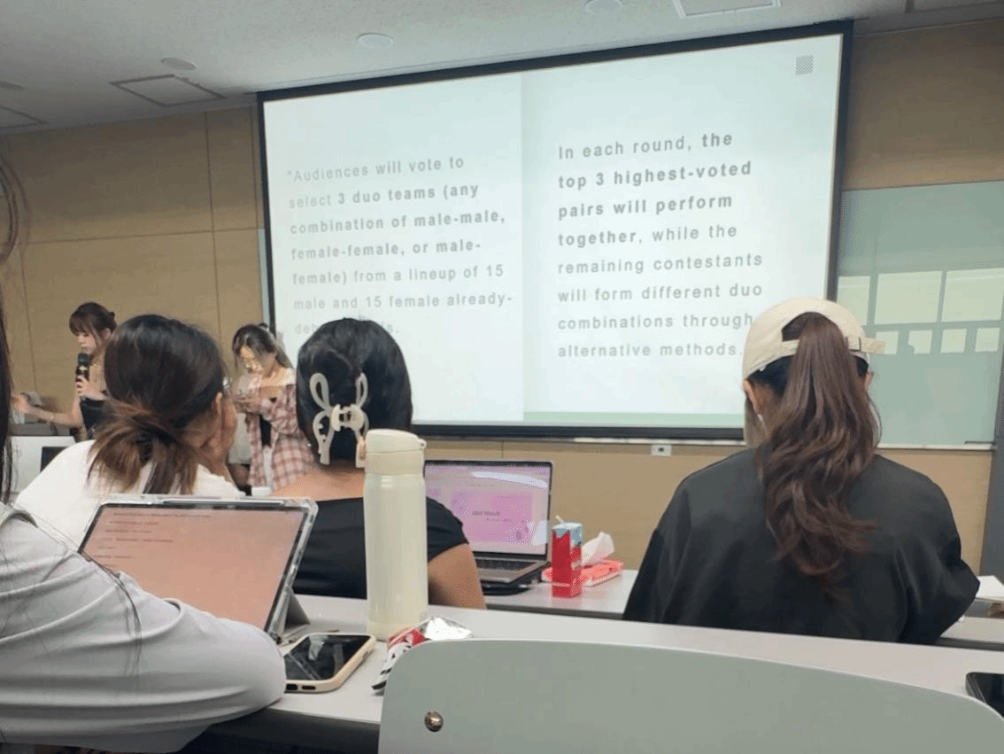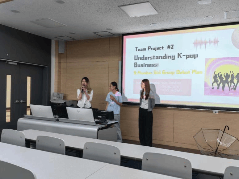 K-pop是韩国的支柱文化产业,近年来的国际影响力不断提升,因此夏令营特别开设了K-pop商业解析课程作为学术课程。课程采用案例分析讲解和小组互动讨论相结合的教学模式,帮助学生深入了解韩国娱乐产业的运作机制。课堂上,学生们从音乐制作、偶像培养到市场推广,系统学习韩流产业链的商业模式,同时探讨韩国文化政策在偶像经济、内容出口和全球文化交流中的作用。