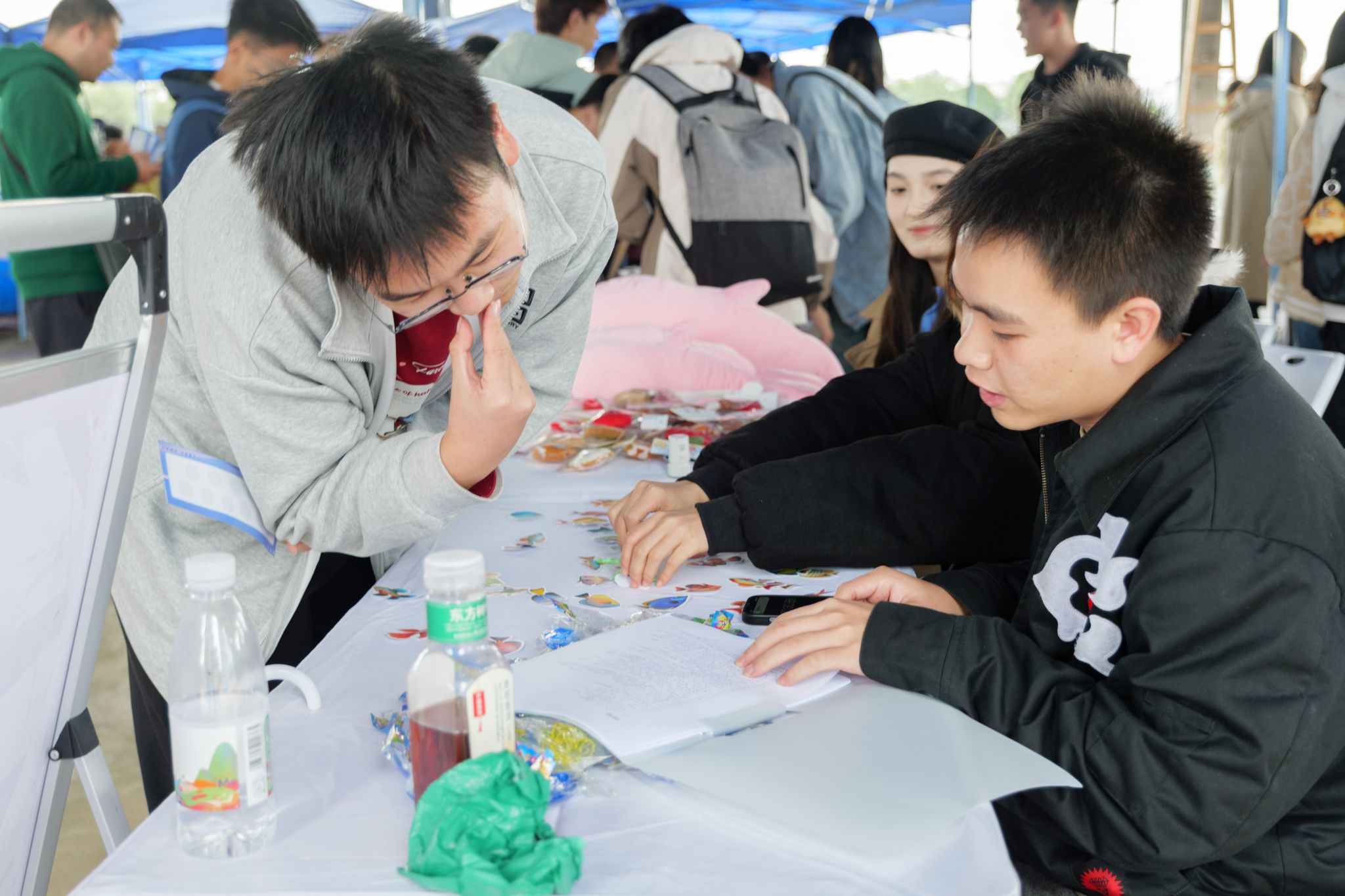 另一边,知识与趣味的碰撞正在上演,鱼类知识问答区前人头攒动。现场设置“娱乐挑战”与“专业竞技”两条赛道,娱乐赛道抢答声此起彼伏,欢声笑语不断;专业赛道则相对安静,同学们凝神思索,在答题纸上写下答案。