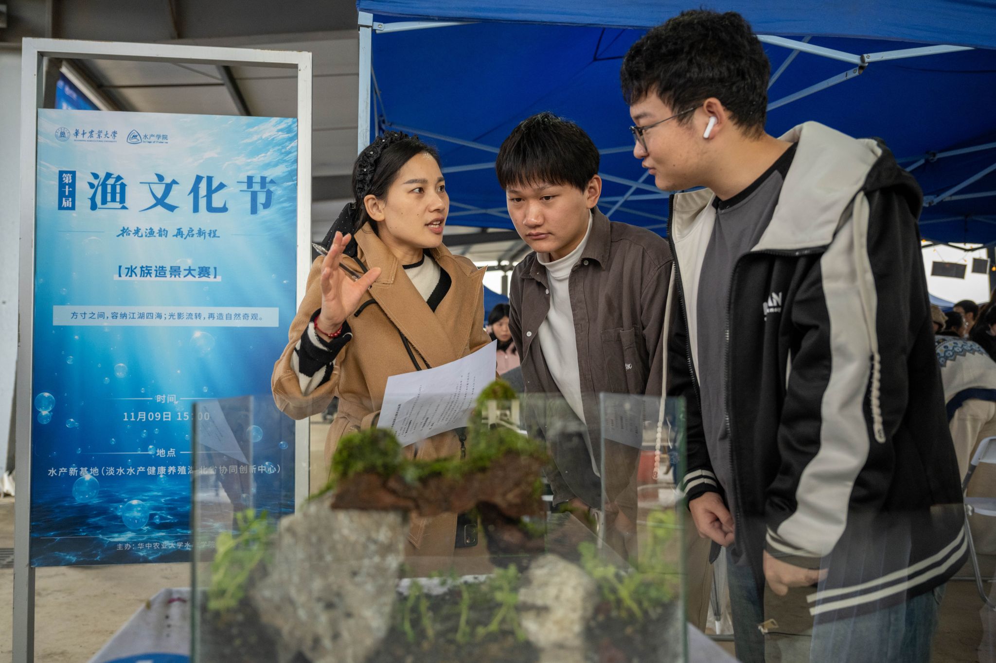 微景观DIY活动区,同学们正专注构建手中的方寸天地。轻石、水苔、赤玉土等专业材料,共同构成植物生长的根基。同学们俯身调整植物布局,交流造景心得,一个完整的微生态系统在斜口玻璃瓶中悄然成型。这场融合美学与生态科学的创意实践,成为本届渔文化节中一道独特的风景。