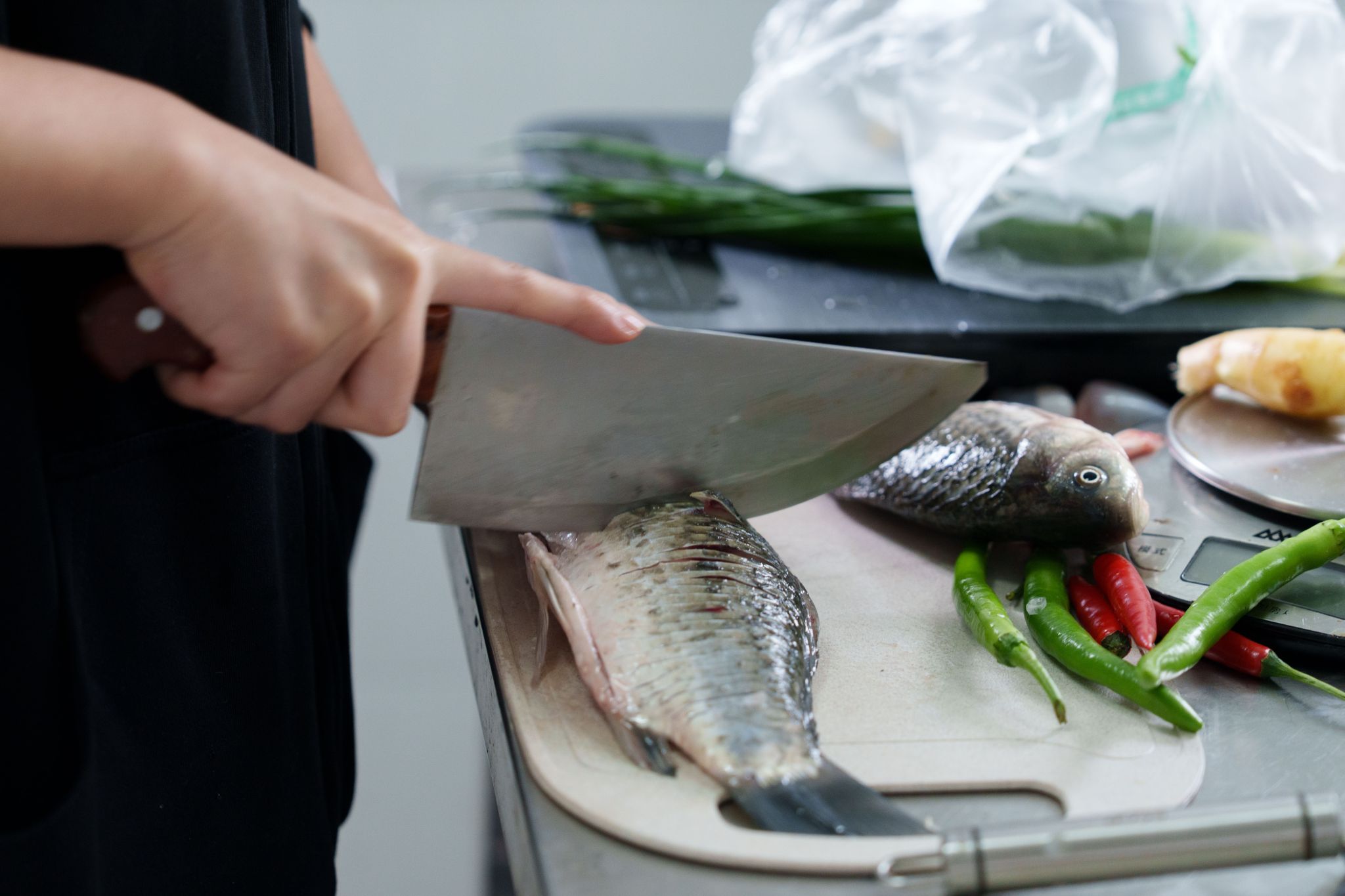水产品加工车间内也是热闹非凡,各组参赛选手同台竞技。选手们自备食材,完成鱼鳞、内脏等前期处理后,根据菜品需求进行深度加工,或切片备做鱼片粥,或切花刀便于入味。