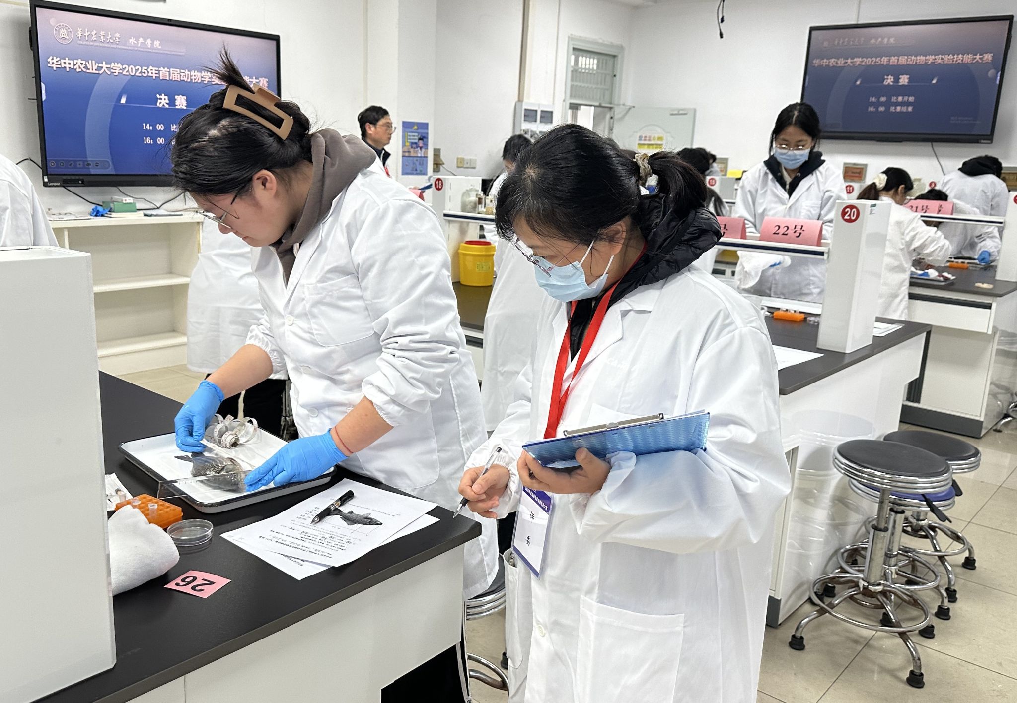 20日下午14时,随着裁判宣布比赛开始,参赛选手迅速进入竞赛状态,在笔试环节沉着答题,在实操环节严谨操作。选手们专注于每一个实验细节,从规范抓取鱼类、精准测量数据,到细致解剖组织、完整摘取鱼脑,充分展现了扎实的专业基础与良好的实验素养。