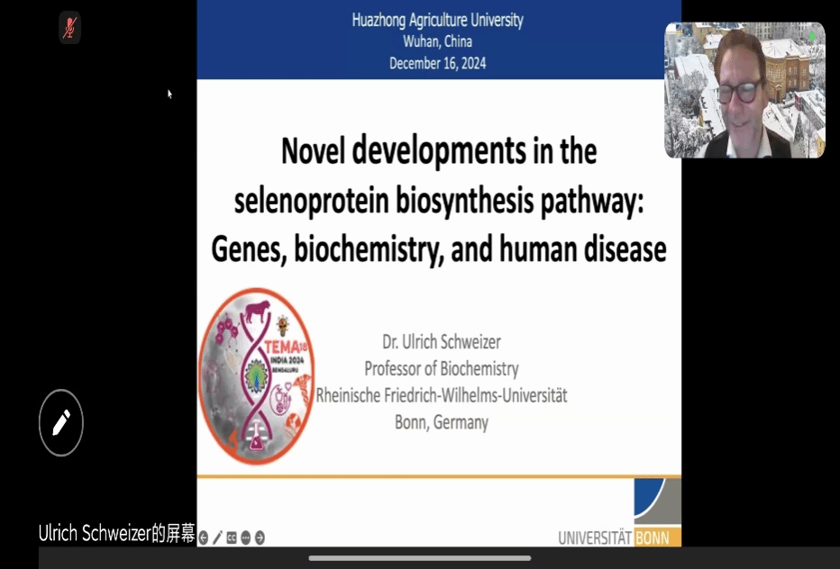 12月16日下午,伟德官网2024年第23期(总412期)“水产讲坛”在线上举行,特邀德国波恩大学的Ulrich Schweizer教授作了题为“硒蛋白生物合成途径新进展:基因、生物化学和人类疾病”的分享。本次讲座由罗智教授主持。
