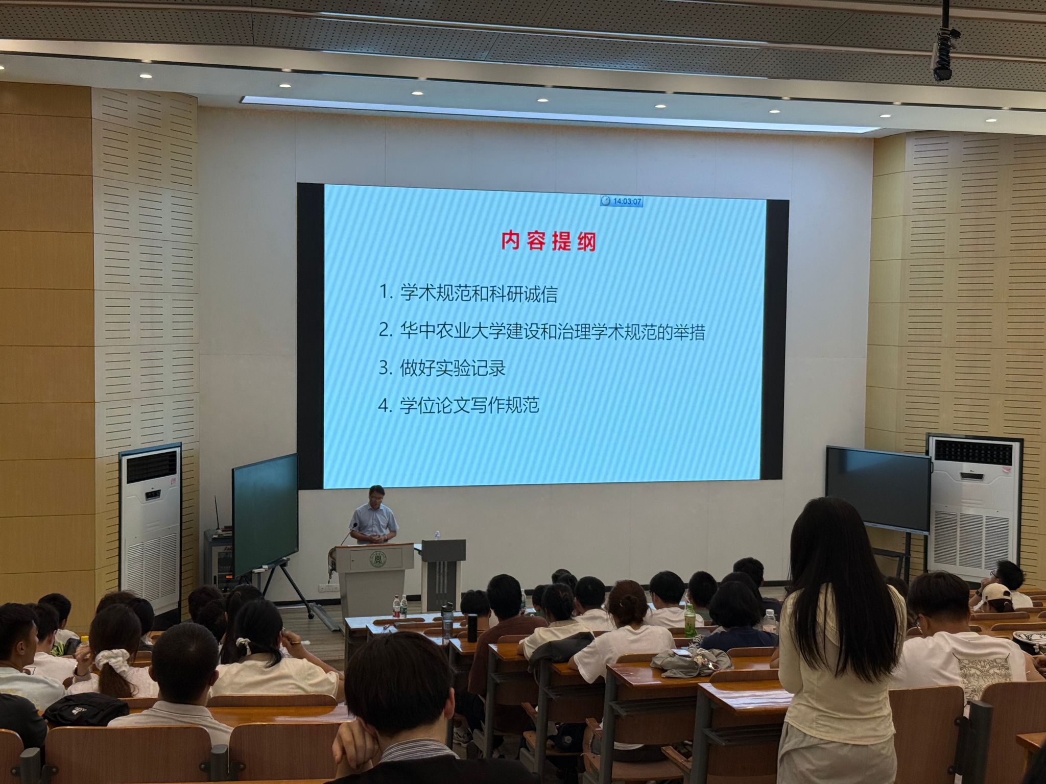 94日,院长张永安教授围绕学术规范与科研诚信进行专题分享。他结合实例剖析学术不端行为的危害,系统讲解实验操作、论文撰写与学位论文规范等环节的核心要求,强调学术诚信是个人发展与学院科研生态的基石。此外,他还介绍了学校在学术诚信建设方面的具体举措,鼓励新生以严谨态度投身科研。