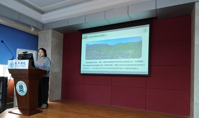 陈薇淇主要从绿色发展的十年成就、内涵意义以及华农行动三个方面进行宣讲,以视频的形式更加生动地展示了近十年国家在绿色发展上取得的成就,陈薇淇提到,“绿色”贯穿在国家发展的方方面面,塞罕坝林场就是我国绿色发展的典型案例,从“一棵松”到“一片海”,森林覆盖率由12%增至80%,林木蓄积由33万m3增至1012万m3,获得了国有林场标兵、联合国地球卫士奖和全国脱贫攻坚楷模等荣誉,是人类发展史上的绿色奇迹。