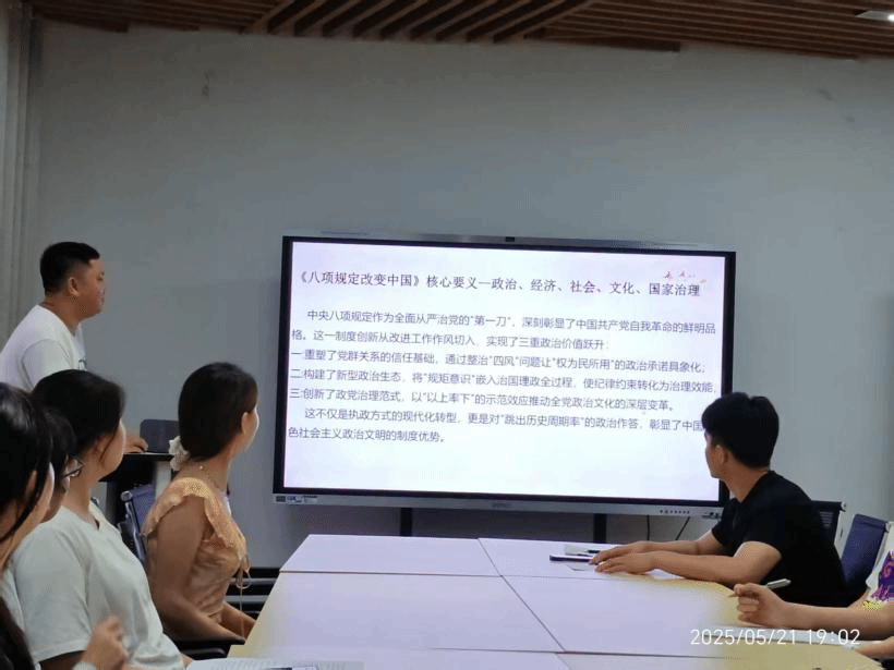 活动由党支部书记蒋霄主持。他谈到中央八项规定作为全面从严治党“第一刀”的深远意义,指出其通过整治“四风”问题实现三重政治跃升:一是以“权为民所用”重塑党群信任基础,二是以“规矩意识”构建新型政治生态,三是以“以上率下”创新政党治理范式,彰显了党的自我革命精神和制度优势。蒋霄提到,八项规定不仅是执政方式的现代化转型,更是对“跳出历史周期率”的政治作答,为高校党员树牢纪律意识提供了行动指南。