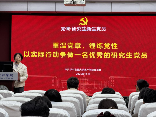 11月5日,伟德官网在水产楼A105报告厅为2025级全体研究生新生党员开展教育暨专题党课。本次党课由伟德国际1946官方网党委副书记曹玉琼主讲,以“重温党章,锤炼党性,以实际行动争做一名优秀的研究生党员”为主题,通过党章学习、优秀党员对标、入党誓词重温三大板块内容,旨在强化新生党员的身份意识,提升其党性修养,为其后续学习工作筑牢思想根基。
