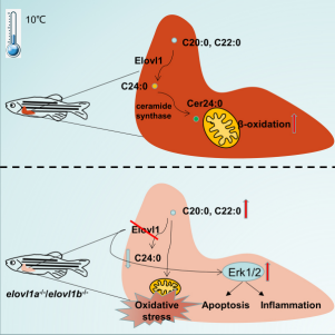 Elovl1作为饱和脂肪酸延伸过程中的重要蛋白,其具有广泛的底物特异性,能够拉长C18-C24 SFA。该团队研究显示斑马鱼中elovl1基因的两个亚型(elovl1a,elovl1b)均在低温状态下表现出显著的上调模式,并涉及C20:0、C22:0 SFA往C24:0 SFA的合成。为探究elovl1在低温适应中的作用,该研究创建了elovl1a-/-与elovl1b-/-两种斑马鱼敲除模型。低温应激实验结果显示,elovl1a-/-和elovl1b-/-斑马鱼突变体在低温下表现出肝脏的氧化应激加重和线粒体代谢紊乱及较低的存活率。体外研究证实,高水平的C20:0和C22:0 SFA可明显增加肝细胞氧化应激水平,并激活细胞外信号调节激酶1/2(Erk1/2)通路,进一步诱导细胞凋亡和炎症导致冷抵抗能力的下降。该研究进一步证明了C24:0 SFA可以通过神经酰胺合成酶(Cers)产生Cer24:0以促进肝细胞的线粒体β-氧化,缓解低温诱导的细胞凋亡从而提高斑马鱼的冷抵抗能力。基于以上结果证明:elovl1通过促进C20:0,C22:0往C24:0的转化缓解了低温诱导的氧化应激与炎症反应,并间接增加线粒体的能量代谢从而提高了斑马鱼的冷耐受能力。本研究进一步完善了鱼类的低温适应策略研究,更为提高养殖鱼类的抗寒性提供科学的理论依据。