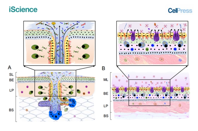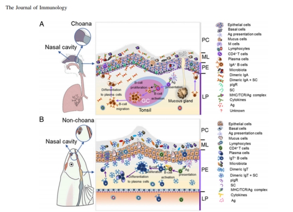 为探究口咽腔黏膜免疫的演化起源及其在低等脊椎动物中的作用机制,徐镇教授课题组以硬骨鱼类虹鳟为研究对象,揭示了鱼类口咽腔黏膜内存在有弥散型MALT。进一步通过寄生虫感染,发现鱼类口咽腔也能够产生类似于哺乳动物的局部天然和适应性免疫应答。此外,研究团队还发现免疫球蛋白IgT在口腔黏膜抗感染过程中发挥重要的作用,sIgT能够通过上皮细胞分泌的多聚免疫球蛋白受体(pIgR)转移到口咽黏液中抵抗病原的入侵。当受到病原感染时,口咽黏膜中IgT+ B淋巴细胞会发生局部增殖,出现显著性增加。研究结果首次发现了MALT在非四足类动物口咽腔中的存在,并且在保护机体、防止病原入侵、维持微生物稳态中发挥重要的作用。