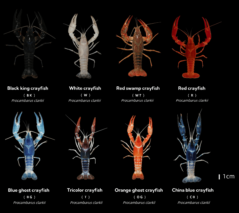 克氏原螯虾(Procambarus clarkii),俗称小龙虾,是我国最重要的水产经济物种之一。近年来,在双水双绿稻虾综合种养模式加持下,小龙虾年产量跃升至我国虾类之首。目前,种质单一是制约我国小龙虾品种改良的瓶颈。为此,该团队从多个地域采集了野生型(野生和养殖群体)与7种不同体色变异的小龙虾种质群体(图1),通过基因组测序与遗传分析首次揭示:小龙虾野生型群体与上述7种体色种质群体存在显著的遗传分化;其中,体色全黑种质——黑魂螯虾(Black King Crayfish)的基因组序列与野生型的差异最大(遗传距离最远);此外,黑魂螯虾表现出“螯小且温顺”的表型与行为特征,具有较大的育种应用潜力。