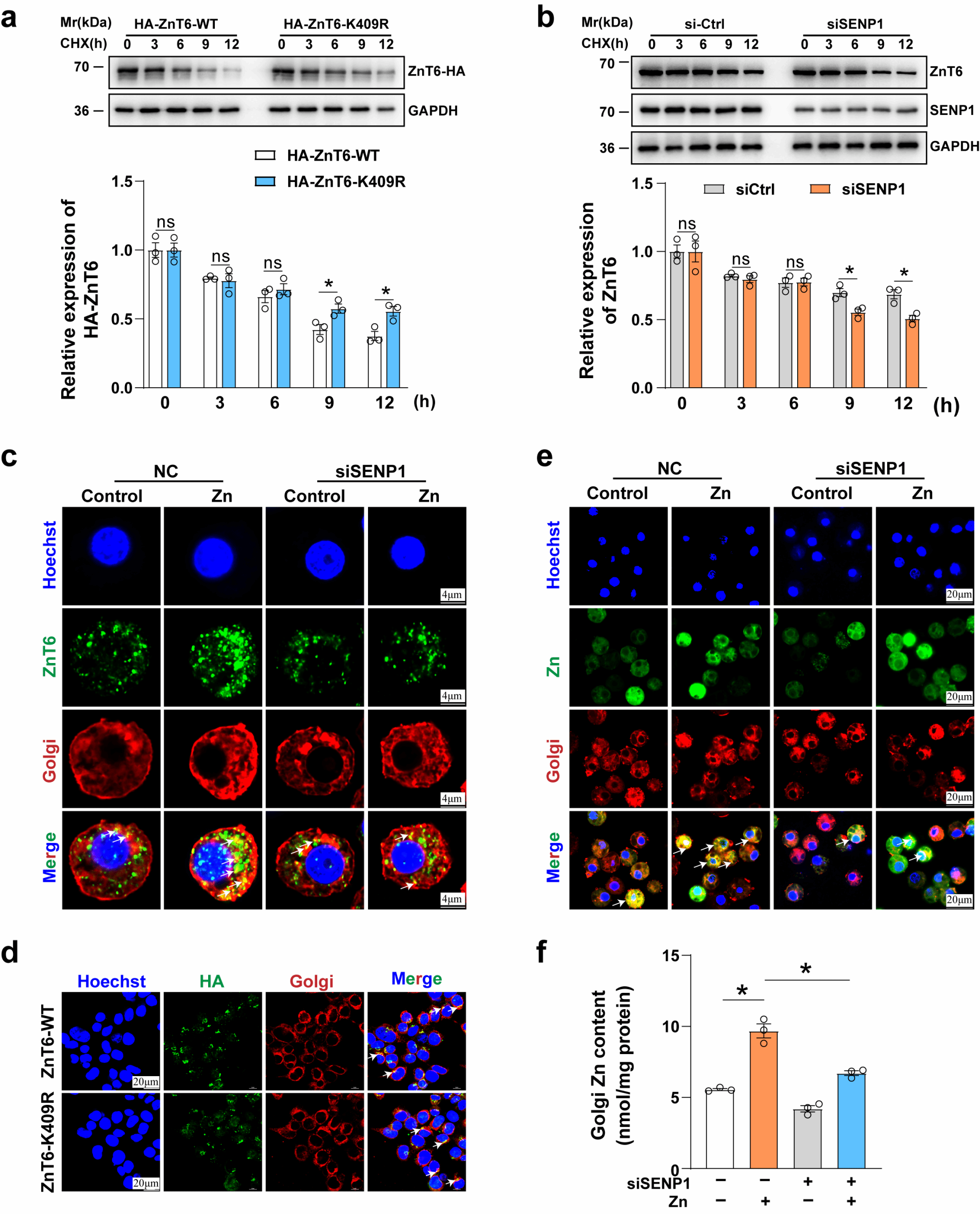 功能分析显示,ZnT6的SUMO化修饰虽未改变其亚细胞定位,但显著降低其蛋白稳定性,导致其蛋白表达被显著抑制。关键机制证实,ZnT6的去SUMO化修饰对其介导锌离子从胞质向高尔基体转运过程具有决定性作用,这一发现为理解锌代谢调控的分子机制提供了新的视角。