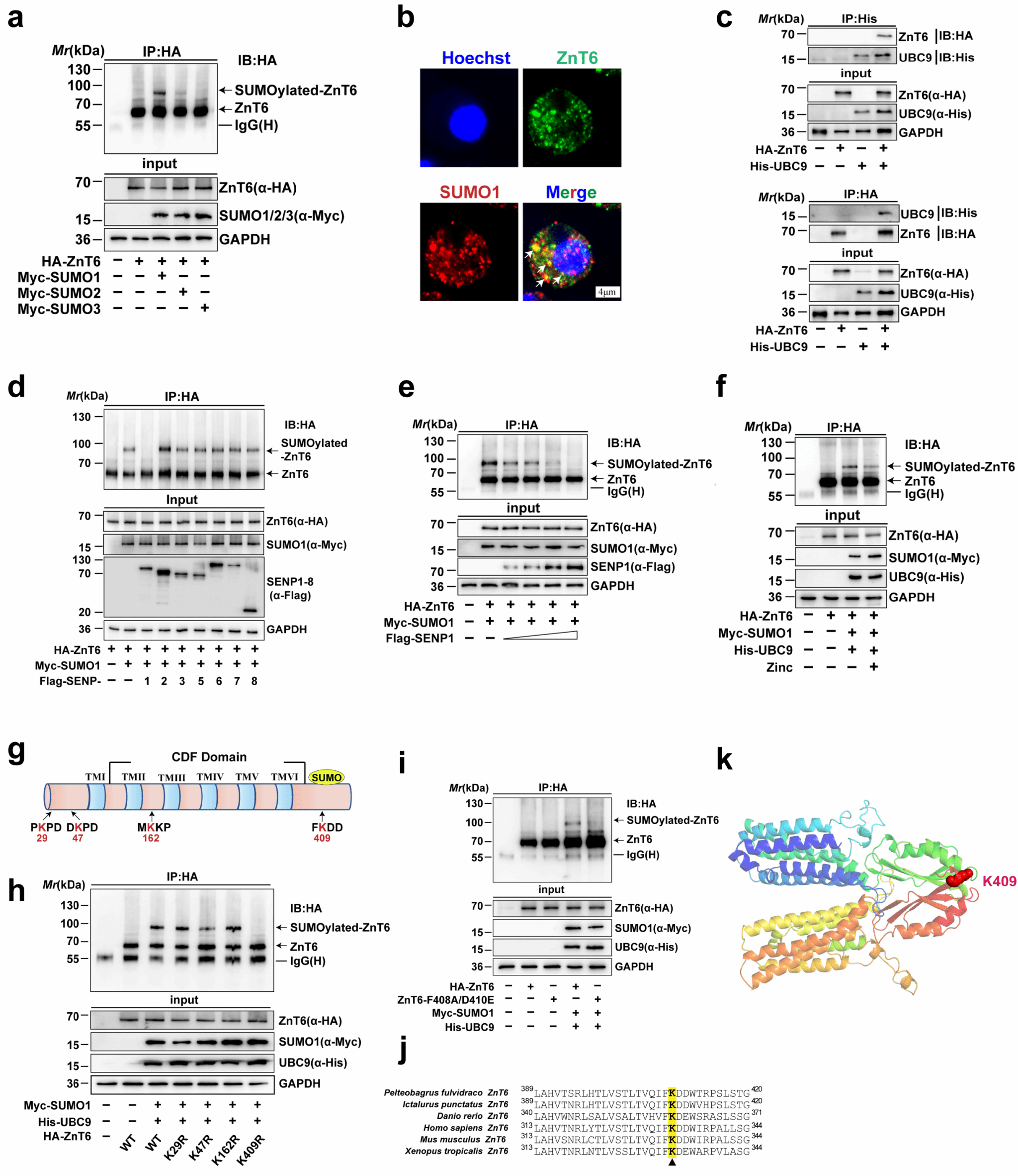为解析SUMO化修饰对锌代谢的潜在调控机制,研究团队以特色经济养殖鱼类—黄颡鱼为研究对象,成功构建体外SUMO化修饰系统。细胞实验证实,ZnT6可以发生SUMO化修饰,且以SUMO1修饰为主。通过免疫共沉淀实验,研究进一步发现ZnT6与E2结合酶UBC9存在相互作用。鉴于SUMO化修饰是动态可逆的过程,研究团队证实去 SUMO 化酶(SENP1)可特异性介导 ZnT6 的去 SUMO 化修饰,且该过程依赖于 SENP1 的保守催化结构域。此外,锌处理及K409R突变均显著降低ZnT6的SUMO化水平,这表明锌介导SUMO1对ZnT6第409位赖氨酸位点的SUMO化修饰水平下调,进而增强SENP1介导的去SUMO化进程。