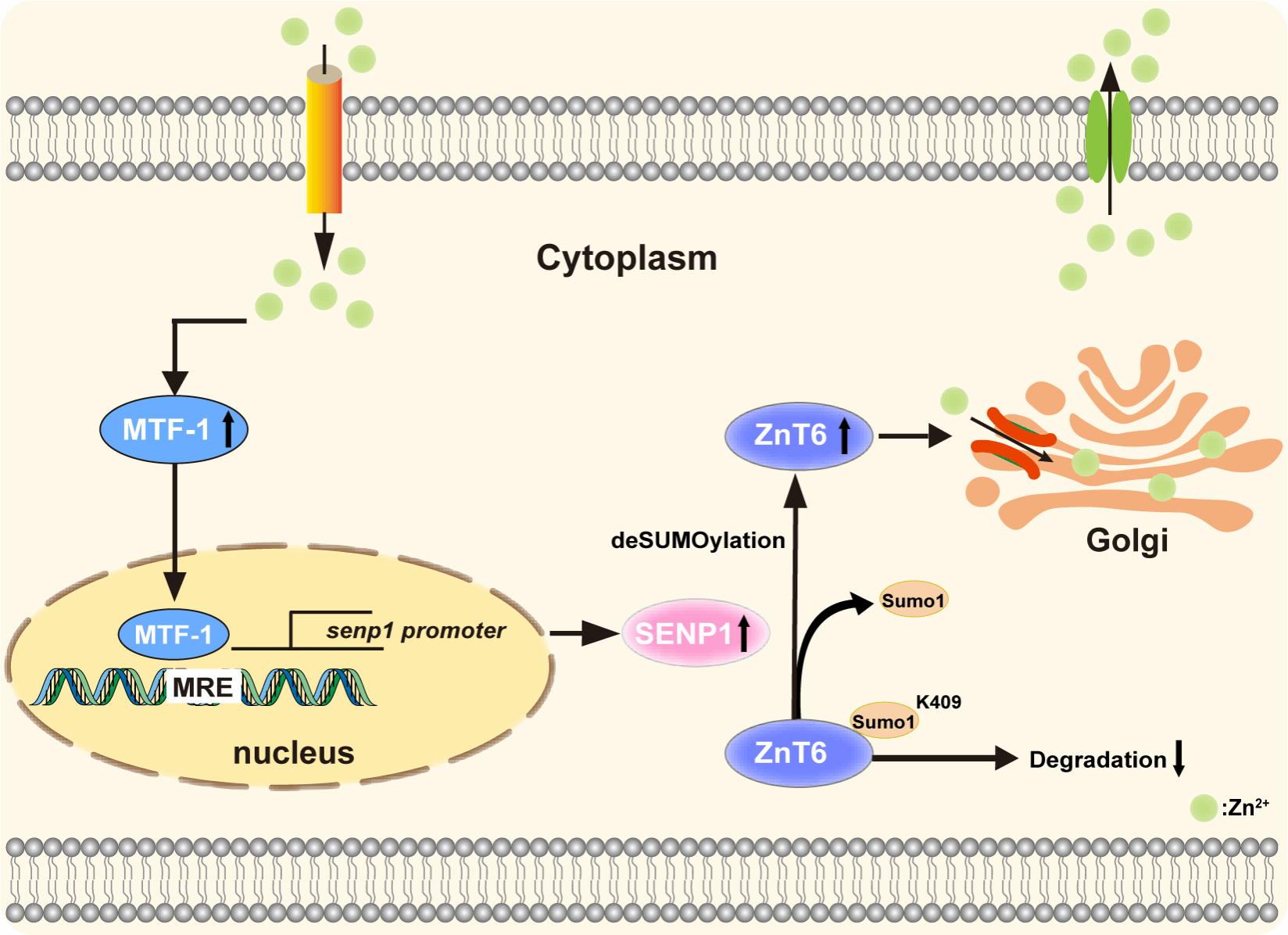 MTF-1/SENP1通路介导的ZnT6 deSUMOylation修饰参与高尔基体锌代谢调节的机制