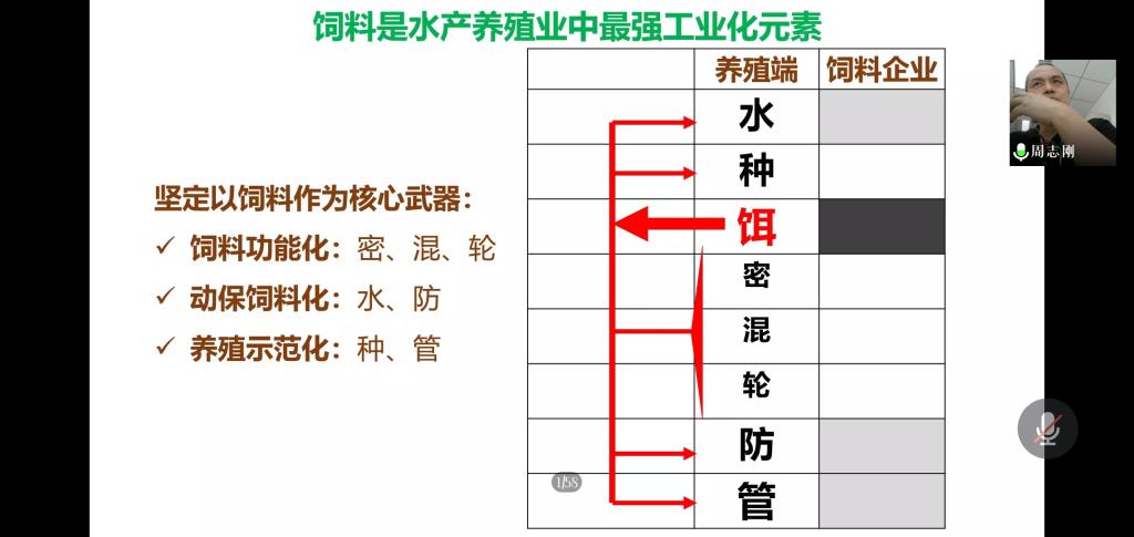 报告开始后,周志刚研究员首先介绍了目前水产品的大众消费情况并对水产品销售的未来进行预测,引出目前气候和地理条件正在驱动养殖结构的改变。周志刚讲到饲料是水产养殖业中最强的工业化元素,强调要坚定以饲料作为核心武器,不断的推进饲料功能化、动保饲料化、养殖示范化。周志刚还强调了传统饲料对企业利润的支撑力不断在减弱,因此目前要着眼于水产饲料的第三次升级——采用共生微生物调控。紧接着为大家解读了共生微生物在饲料的调控原理,阐明鱼类肠道菌群模式不同于畜禽及人类,提示调控靶标必须做出区别,不可同于畜禽及人类。