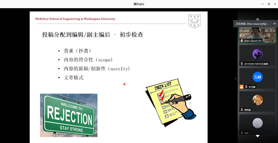 (伟德国际1946官方网通讯员 郑建铎 供图 郑建铎)7月30日上午,伟德官网第20008期水产讲坛学术活动通过腾讯会议在线上举行,美国圣路易斯华盛顿大学的贺震教授作题为“如何发表高水平科研论文”的报告。贺震教授目前担任多个期刊的主编、共同主编,拥有丰富的审稿经验,了解审稿的流程。本次报告面向全院师生,由学院教授罗智主持。