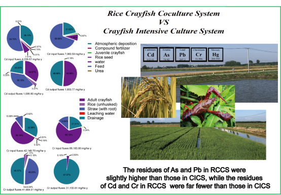 研究结果显示,饲料镉输入占两个模式镉总输入通量的50%以上,而砷和铬的输入通量主要来自灌溉水,铅的主要输入通量为大气沉降。虽然稻虾综合种养模式中砷和铅的最终残留量略高于小龙虾精养模式,但镉和铬残留量远低于小龙虾精养模式。值得注意的是,在小龙虾养殖全过程中,稻虾综合种养模式中稻田土壤镉、砷和铬的含量虽然表现出逐渐增加趋势,但水稻种植一个月后开始下降;而在小龙虾精养模式中表现出持续的上升趋势。第二年秸秆还田时,稻虾综合种养模式中被秸秆吸收和固化的重金属并没有增加模式中主要组分的砷和铅的残留量。相反,残留在稻虾综合种养模式中的镉对水、土壤和小龙虾肝胰脏镉的增加量显著低于小龙虾精养模式。同时,小龙虾精养模式的重金属污染指数为0.781,而稻虾综合种养模式的重金属污染指数仅为0.543,远低于安全值。