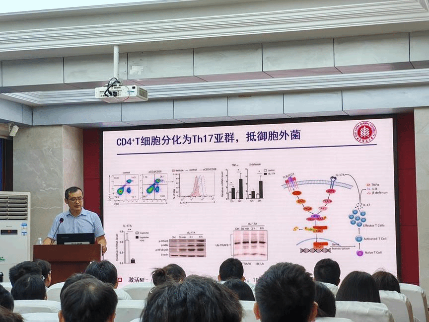 随着讲座接近尾声,同学们踊跃发言,提出了诸如“如何界定T细胞免疫、B细胞免疫重要性”、“进行实验处理前的禁食活动是否影响实验结果”等问题。与会老师也与杨教授进行了友好且深入的探讨交流,报告厅内不时传来阵阵掌声,大家表示受益匪浅。