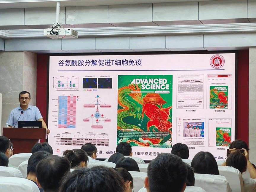 杨嘉龙教授一直聚焦在对T细胞的研究中,本次讲座主要围绕“鱼的行为如何触发免疫细胞的各项调控机制,以增强T细胞免疫”这一主题展开。动物基于免疫系统抵御外来病原体的入侵,随着生命不断的演化,动物自身产生了两套免疫系统。先天免疫作为一套古老的“非己识别”系统,在无脊椎动物和脊椎动物都适用。在此基础上诞生了以T细胞、B细胞为核心介导的适应性免疫系统。与前者相比,适应性免疫具备一定的高技术性:该系统能通过V(D)J重排产生高度可变的抗原受体,数量经初步估计可达1016以上;适应性免疫具有功能分化的淋巴细胞亚群,与抗原相互作用可产生特异性反应并进行细胞增殖;值得一提的是,适应性免疫还能形成以T细胞、抗体为核心的免疫记忆效应。