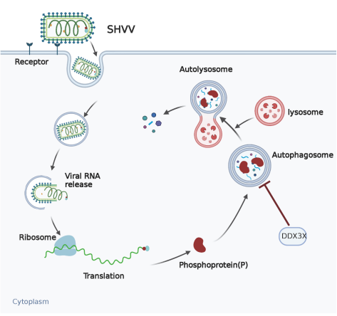 模式图:SHVV感染宿主细胞后,P蛋白被合成。DDX3X与P蛋白相互作用,阻止SHVV P通过自噬-溶酶体途径降解。