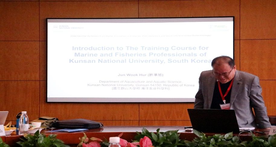 韩国群山国立大学的Jun Wook HUR教授作了题为“韩国群山国立大学海洋和渔业专业人员培训课程简介”的报告。Jun Wook HUR教授先后谈到了他们学校水产养殖与水产科学系的发展历史、水产养殖品种、研究设施、课程要求和就业支持等方面,让大家清晰全面地了解了他们学校海洋和渔业专业人员培训课程情况,有效促进了不同国家高校之间的教学交流。