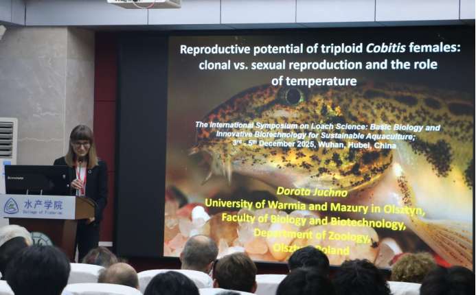 奥尔什丁瓦尔米亚玛祖里大学的Dorota JUCHNO副教授作了题为“三倍体泥鳅雌性的繁殖潜力:克隆与有性繁殖及温度的作用”的报告。Dorota JUCHNO副教授介绍了繁殖特性与温度影响的细节。波兰泥鳅的产卵期集中在6-7月,她观察到三倍体雌性的产卵期长于二倍体,且产卵周期内可产卵三次,卵巢中存在各阶段卵母细胞。她指出三倍体雌性的卵子不仅能通过雌核发育进行克隆繁殖,还能整合精子基因组形成四倍体,但四倍体雄性不育,精子发生会停滞于早期阶段。温度对发育的影响也很显著,18℃时不同母本基因组的胚胎发育成功率差异明显,在10%-30%之间,28℃时整体发育成功率下降,且三倍体和四倍体幼体存在脊柱弯曲、无胸鳍等畸形,畸形与基因组组成、温度均有密切关联。