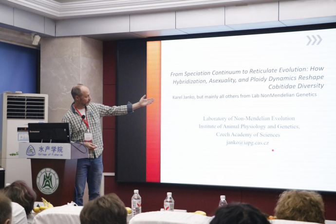 捷克科学院的讲师Karel JANKO作了题为“从物种形成连续体到网状演化—杂交、无性与倍性动态如何重塑鳅科多样性”的报告。他指出鳅科染色体结构与调控变异与无性繁殖、多倍化密切相关。在多个接触带中,亲本种分化程度可预测杂交后代形成有性重组群体或通过减数分裂前基因组内复制产生克隆配子。他提出两点新认识:一是在稳定克隆谱系内,两套亲本基因组并非静止,会发生可检测的基因转换与重组,导致杂合性逐渐丢失;二是生殖路径具有“剂量依赖性”,相同亲本基因组可因倍性平衡差异产生二倍体克隆或三倍体有性个体,这种“切换”为克隆体与亲本种间提供了短暂的等位基因交换窗口,形成非孟德尔式渐渗模式,最终构成网状演化格局。他建议建立协同研究框架,将网状演化历史纳入物种界定与比较基因组学研究。