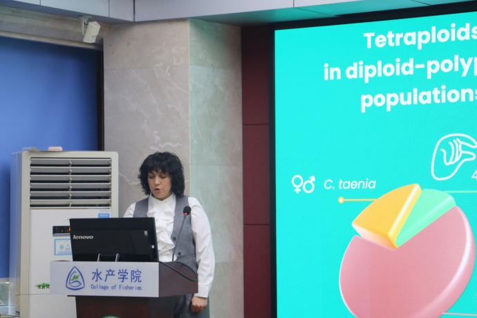奥尔什丁瓦尔米亚玛祖里大学的助理教授Olga JABŁOŃSKA作了题为“四倍体鱼类:温度与母本基因组独立的后代形成及精巢生理研究”的报告。她聚焦鳅科鱼类杂交多倍化相关研究,发现四倍体鱼类孵化初期三倍体比例较高,后期显著下降,且高温会加速这一比例的衰减过程。其研究显示,四倍体雄性精巢中的雄激素受体表达降低,但激素信号通路正常,基于此提出自噬可能参与生殖系统维持的假说,相关功能基因正处于验证阶段。