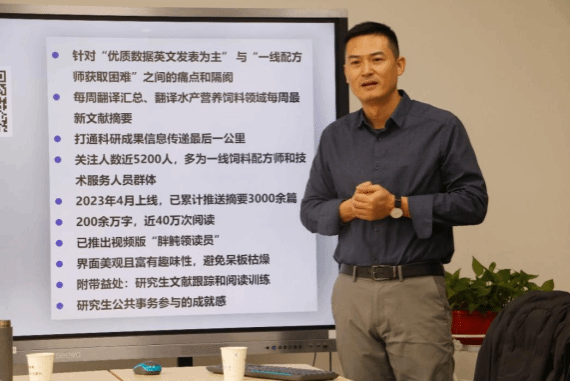讲座中,徐后国研究员详细阐释了团队打造的“胖鲔”文献速揽工具、“有料”公益性技术公开课及“水产有料”数据库三大核心成果:通过智能化工具提升文献检索效率,以公益课程打通技术普及链路,靠整合型数据库汇聚饲料原料营养与消化率数据,多维度推动水产营养领域的数据共享与价值释放。他表示,平台建设的核心是让数据“服务产业”,后续还将拓展功能模块,进一步助力行业标准化与智能化发展。