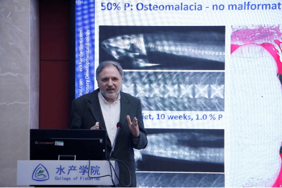 Paul Eckhard Witten教授首先以大西洋鲑和斑马鱼为研究对象,介绍了真骨鱼对钙需求的灵活性,这种需求主要取决于饲料中的磷含量。他指出,高温环境与饲料中磷缺乏会导致鱼类骨骼畸形,因此生产中常通过增加饲料磷含量来预防畸形。然而,提高磷含量也会带来新问题,矿物质与有机物的比例上升会降低骨骼的抗拉强度,使骨骼变得脆弱。在斑马鱼模型中,低磷饮食反而能够促进骨形成,额外形成的骨骼经矿化后增加了矿化骨的总体积。他透露,实验室后续将公布动物对低磷和高磷摄入反应的更多研究结果。最后,他强调骨的形成与矿化是两个独立的过程,骨矿化由基质驱动并受细胞精细调控。