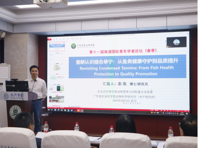 广东省农业科学院彭凯博士的汇报主题为“重新认识缩合单宁:从鱼类健康守护到品质提升”。颠覆性重构缩合单宁认知,打破其“抗营养因子”的传统定位。他立足水产高密度、高应激、高风险养殖需求,系统开展缩合单宁资源开发、机制解析与产品创制。团队攻克环保型酶解提取、低成本纯化、结构鉴定等关键技术,建立行业标准与规范;证实缩合单宁在鱼虾中具有抗氧化、抗应激、抗炎、保肝护肠、调节肠道菌群等功能,阐明Keap1-Nrf2/ARE信号通路调控机制。研究成果为水产健康养殖与脆肉鱼产业升级提供核心支撑。